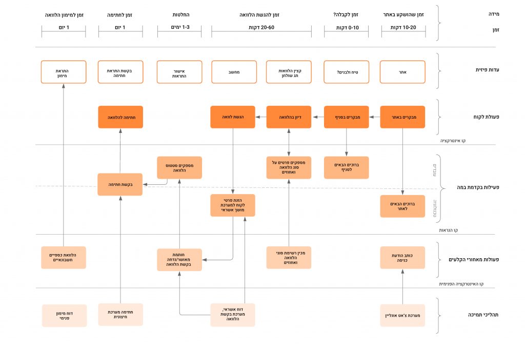 תכנון דיאגרמת לקוח הוא כלי שעוזר לצוותים להבין כיצד הלקוח רואה או חווה את תהליך השירות של העסק. זהו תרשים המדמיין יחסים בין אנשים, תהליכים ונקודות מגע פיזיות ודיגיטליות הקשורות למסע לקוח ספציפי. להרחבה על מסע הלקוח לחצו כאן.